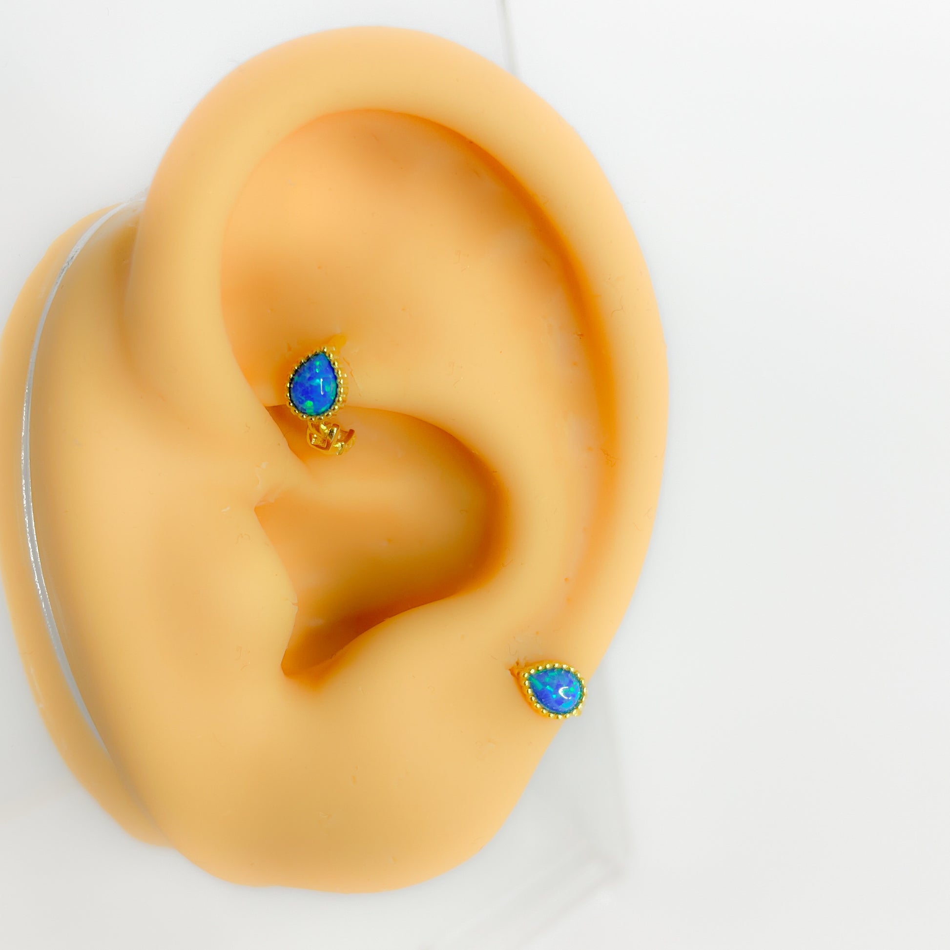 Klein, edel und mit einem Hauch Farbe: Dieses Rook-Piercing besticht durch seinen tropfenförmigen, tiefblauen Stein, der elegant in Szene gesetzt wird. Gefertigt aus hochwertigem 925er Sterling Silber und vergoldet mit 18K Gold, sorgt es für einen stilvollen Akzent im Ohr.
